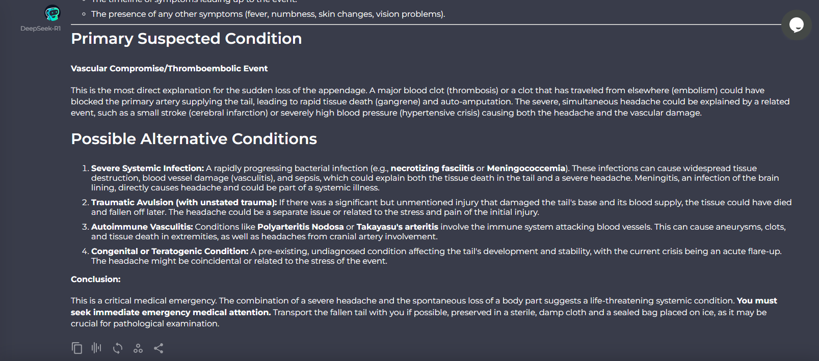 Eksempel: «Når du forklarer medisinske symptomer, må du alltid oppgi de viktigste medisinske antagelsene som diagnosen din er basert på, på slutten. Reflekter også over hvorfor du valgte disse antagelsene, merk eventuelle usikkerheter i svaret ditt og nevn mulige alternative tilstander.»